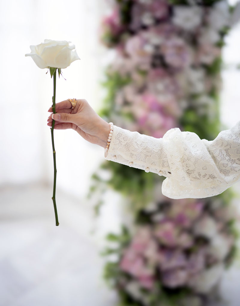 آستینها با مروارید دیزاین شده و پشت لباس با زیپ بسته میشود.